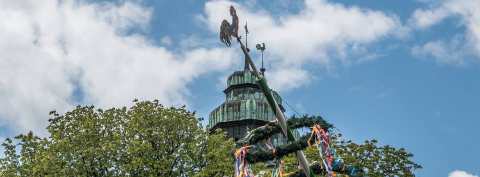 Verwundert haben viele Hövelhofer beim Spaziergang am Maifeiertag 2020 ihre Blicke auf das mehr als 350 Jahre alte Jagdschloss gerichtet: Den Vorplatz ziert ein grün-weißer Maibaum, komplett mit Maikranz und Wetterhahn. Am Donnerstag, 30. April 2020 wurde der Baum, seit alters her ein Symbol für Fruchtbarkeit, Wachstum und Standhaftigkeit, vom Bau- und Servicebetrieb der Gemeinde Hövelhof im Handumdrehen aufgerichtet.